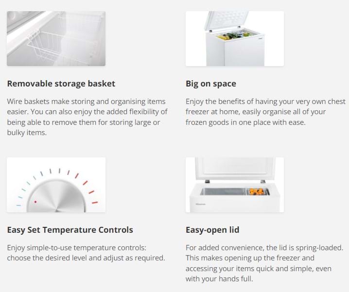 Need large freezer capacity? Not a problem thanks to the HRCF145 and its generous 145-litre capacity. This model stores plenty of frozen food and an adjustable wire rack makes everything easily accessible. An adjustable temperature control keeps food at the proper storage conditions. For convenience the lid is spring loaded and its water drain ensures maintenance-free operation.