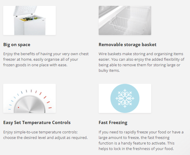 Need large freezer capacity? Not a problem thanks to the HRCF200 and its generous 200-litre capacity. This model stores plenty of frozen food and an adjustable wire rack makes everything easily accessible. An adjustable temperature control keeps food at the proper storage conditions. For convenience the lid is spring loaded and its water drain ensures maintenance-free operation.