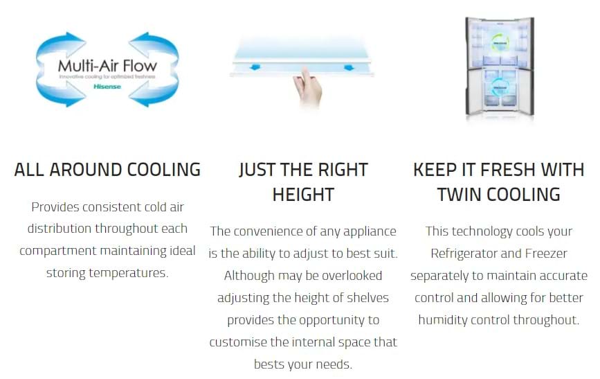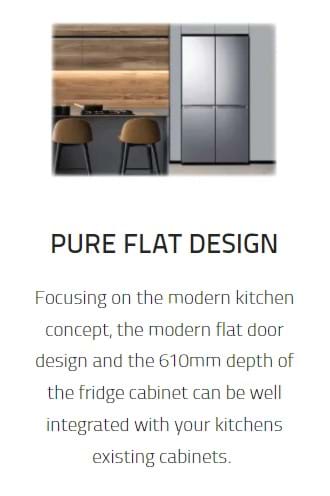 Open your world to luxury with the 454 litre Hisense 4-door refrigerator, a new level of sophistication added to the PureFlat collection. The Stainless Steel door finish encapsulate true minimalist design, giving a luxurious look and consistent feel to any new or remodeled kitchen. Features include inverter technology, triple-zone and non-plumbed water dispenser.