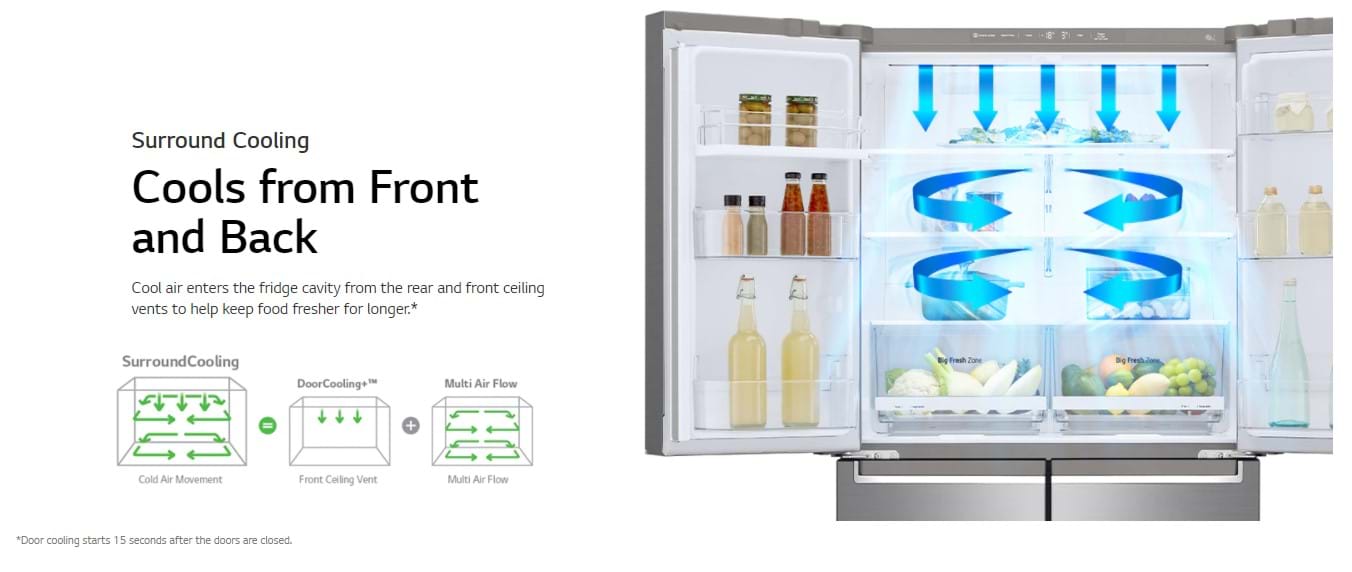 The French door configuration makes it easy to access what’s inside and comes in handy when packing away items after a big supermarket shop. You can organise your food and beverages with ease using the spacious compartments and intelligent interior configuration. If you need to make space for awkwardly shaped items, the retractable shelf enables you to make room for tall or large items—perfect for those who enjoy entertaining. The ultra-efficient Surround Cooling system delivers outstanding air circulation thanks to strategically placed air vents located inside your fridge. By providing your food with ideal cooling conditions, you can enjoy fresh food for longer.