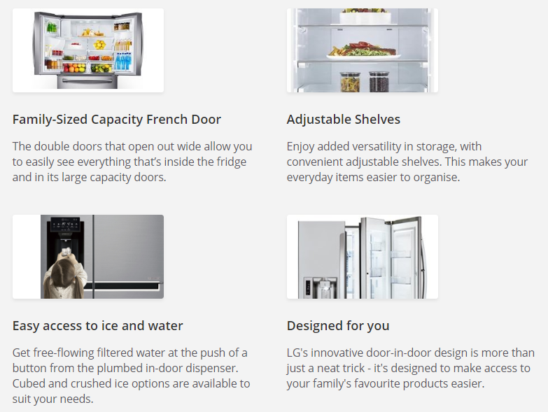 The 730 litre stainless steel french door from LG was designed to provide ultimate organisation. Easily find your favourite frozen items with the three-layered freezer. The door-in-door design lets you access your favourite items conveniently while reducing cold-air lose. Get continuously filtered water with the slim water & ice system, designed to fit taller containers while taking up less space. Keep your food fresher for longer with the temperature controlled drawers.