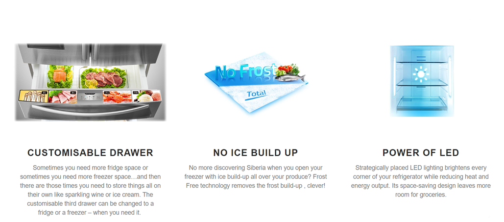 Our Hisense designers have delivered the smartest French Door fridge yet when it comes to capacity, big families, big entertainers and foodies. With the integrated ice and water dispenser your home now has a permanent supply of chilled water and able to make up to 1.8kg of crushed or cubed ice (authorised plumber required). The 701 litre is engineered for efficiency with its Inverter Compressor Motor. The interior space is massive and adaptable with innovative storage solutions such as a slide-away shelf, a dedicated frozen pizza box space and a customisable third drawer that can turn to a fridge or freezer. Other features include multi-function touch control panel, super freeze/cool settings and LED interior lighting.