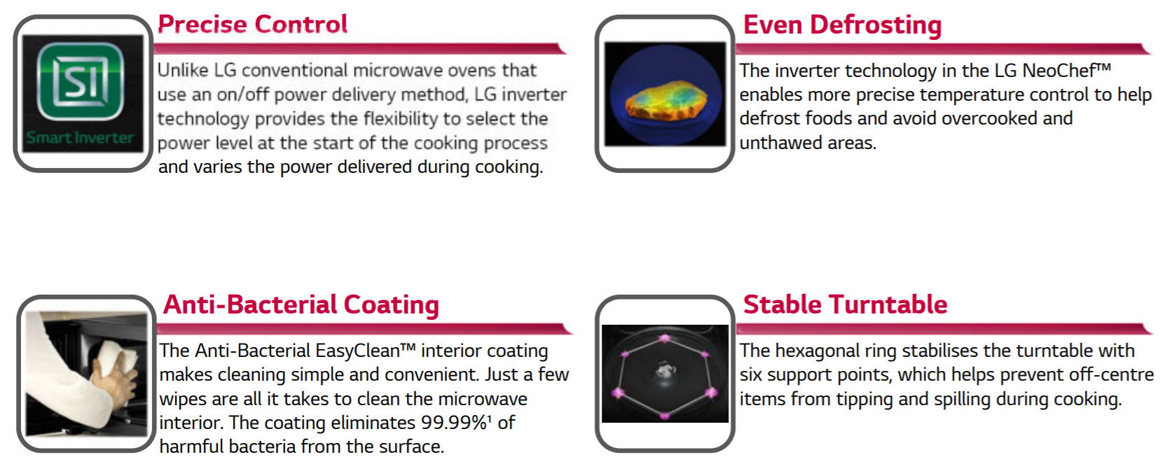 This LG 42L Inverter Microwave’s sleek minimalist design features a black glass finish and a touch control panel to perfectly blend in with your modern kitchen. With 22 different cook menus, 4 defrost options and 10 varying power levels of up to 1200watts, LG’s NeoChefTM technology promises to reheat and defrost 33% faster than your average microwave whilst maintaining evenly cooked foods to the core. Moreover, SGS confirms that LG’s Anti-Bacterial EasyCleanTM makes interior cleaning convenient with only a few wipes yet eliminating 99.99% of surface bacteria.