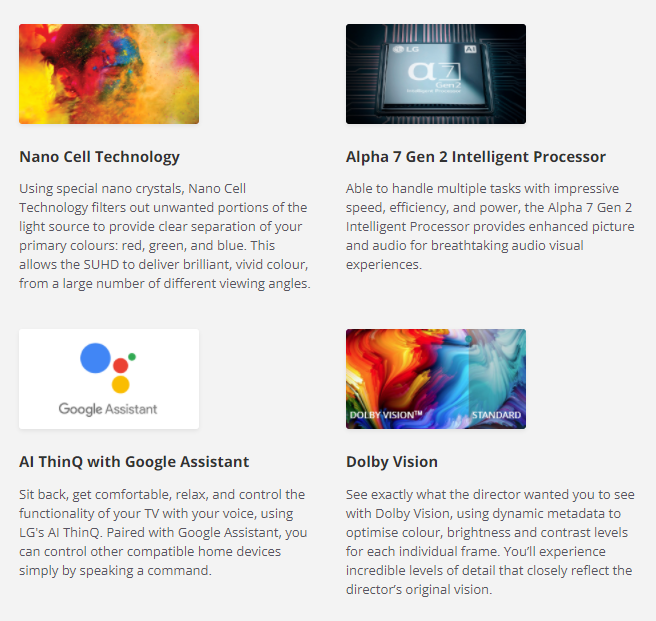Powered by the Alpha 7 Gen2 Intelligent Processor, any audio or visuals coming through this LG SUHD TV will be enhanced, ideal for movie nights, game nights, or for watching your favourite TV shows. AI ThinQ allows you to access Google Assistant through a compatible smart device or your LG TV’s Magic Remote.