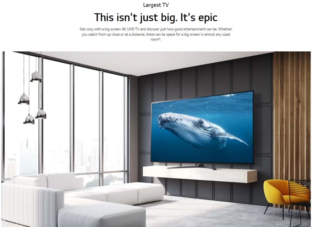 With their sleek styling and unique design features, LG TVs are an impressive statement piece in any living room. This huge-screen 86-inch 4K Smart TV boasts a stunning 8.3 million pixels of clarity for incredibly vivid picture quality.