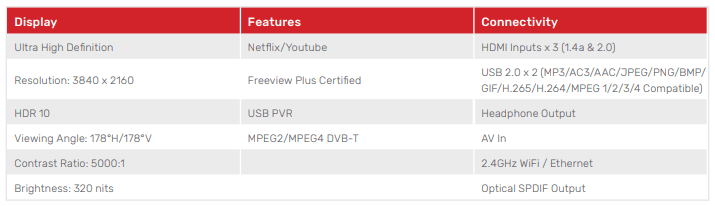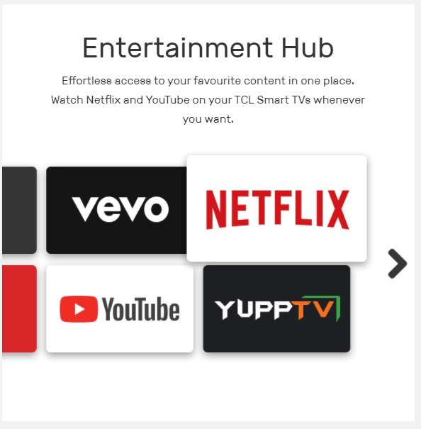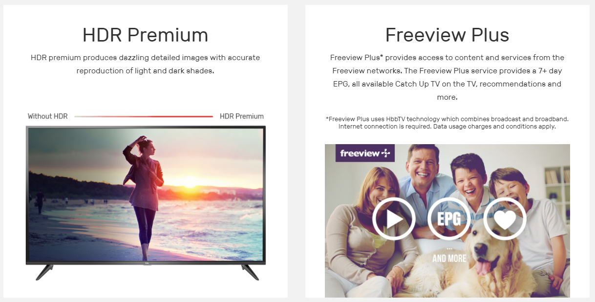 TCL represents effortless access to your favourite content in one place. Watch Netflix and YouTube on your TCL Smart TVs whenever you want. HDR premium produces dazzling detailed images with accurate reproduction of light and dark shades. Freeview Plus* provides access to content and services from the Freeview networks. The Freeview Plus service provides a 7+ day EPG all available Catch Up TV on the TV recommendations and more.