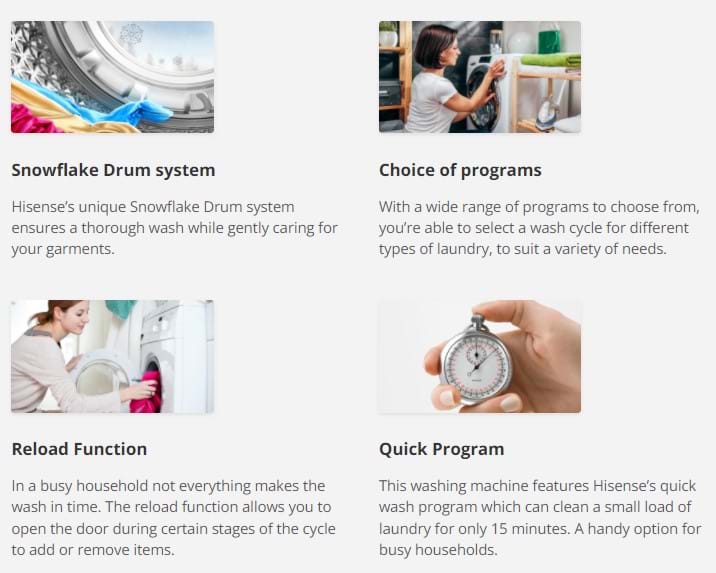 Hisense New Front Load Washing Machine is engineer for efficiency bringing an easier washing experience, including 15 washing programs with 2 extra washing options and big display which let’s you start the washing program easily and see washing status at a glance. The Snowflake Drum will provide better cleaning results plus enhanced protection for your clothes. The Hisense Quick Wash is perfect for washing loads up to 2kg with a speedy 15 minute fast wash!