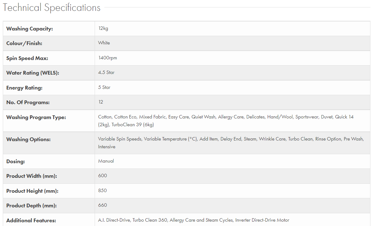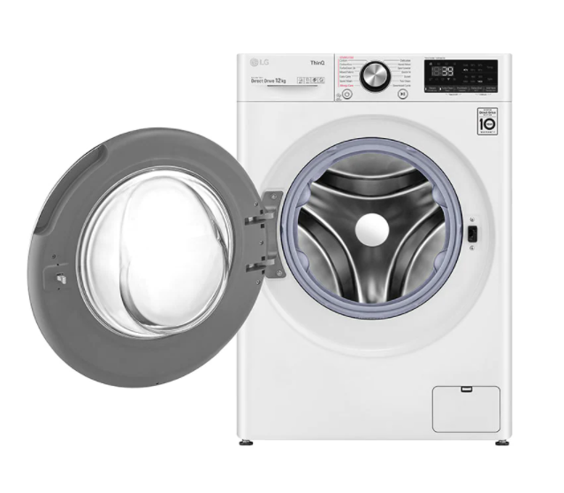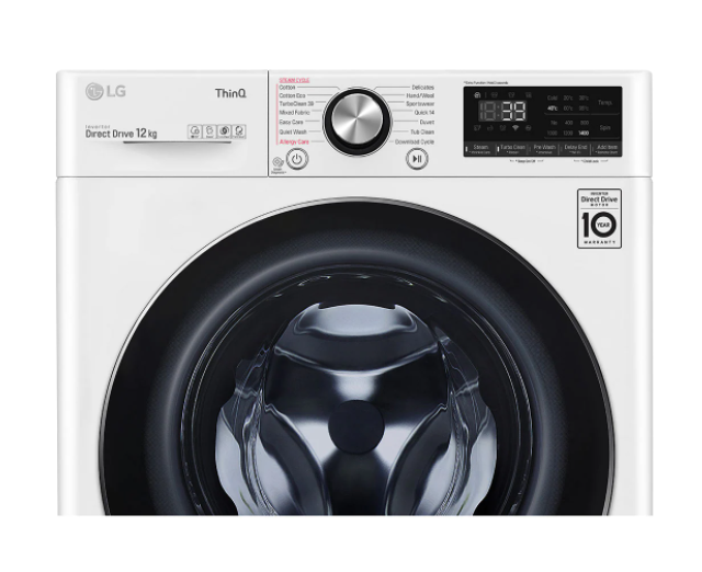 This white LG 12kg Front Load Washer WV9-1412W features Allergy Care and Steam Cycles. Simply add steam to selected cycles to assist in the removal of up to 99.99 percent of common household allergens. A TurboClean 360 wash can wash half a load of lightly soiled clothes in 39 minutes, where four pressurised water jets speed up the wash and rinse phases. For Cotton and Mixed Fabric cycles, this washers clever Al Direct Drive technology assesses the weight and fabric softness of the load and auto-activates the best wash motions for a thorough clean and care of fabrics. This large LG washer has a 4.5 Star WELS Water Rating and a 5 Star Energy Rating for savings at bill time. Plus, the washers ThinQ technology allows you to remotely start or monitor your wash progress when you're not home as well as diagnose and troubleshoot issues.