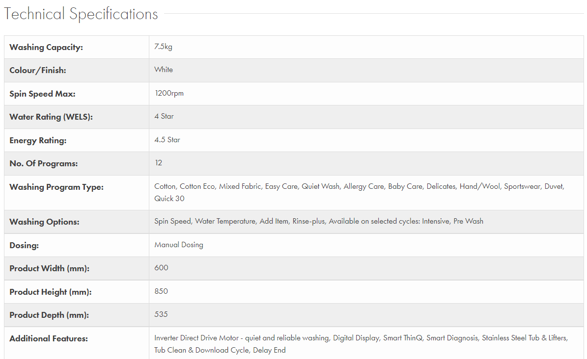 This white LG 7.5kg Front Load Washer with Steam WV5-1275W expertly handles clothing and bedding. It has 12 wash programs to suit each load, including two dedicated steam cycles for allergen-free washing results: choose Allergy Care to have up to a 4kg load of bed linen or clothing optimally washed to eradicate common allergens, or the Baby Care wash cycle to leave your little ones' clothing or cot sheets hygienically clean and fresh. There's a 30-minute Quick Cycle for lightly soiled loads of up to 2kg that can't wait for the weekend. For your everyday Cotton and Mixed Fabric cycles, this washer's AI Direct Drive technology assesses the weight and fabric softness of the load and auto-activates the best wash motions for a thorough clean and care of fabrics. It has a 4 Star WELS Water Rating and 4.5 Star Energy Rating for savings at bill time. This LG washer's SmartThinQ capability allows you to start a cycle and monitor it when you're not home via the downloadable LG SmartThinQ app on your compatible smartphone (mobile 3G/4G or Wi-Fi connection required). You can add in a forgotten pair of socks after the load has started with the 'Add Item' option.