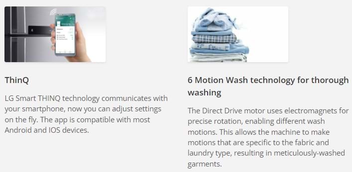 Unlike conventional washers, this machine moves to the beat of its own drum. The 6 Motion Wash technology allows your laundry to be thoroughly cleaned with different movements. Not all fabrics and garments are the same, so this unit uses the ideal combination of motions for specific laundry items. The specialised steam cycle deeply cleans your clothes, makes garments easier to iron while eliminating allergens - an excellent option for allergy-prone or sensitive skin. The Turbo Clean feature ensures your load finishes quickly, saving you time and energy. The LG Smart THINQ technology allows you to use your smartphone to adjust settings whilst you’re out of the house and also runs diagnostics on your washer for hassle-free maintenance.
