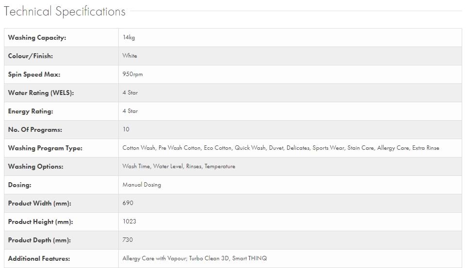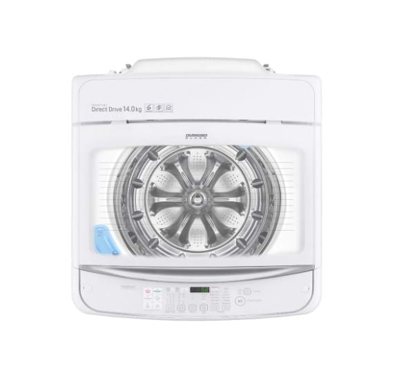 This white LG top loader washer has a high 4 star WELS water rating and a 4 star energy rating for bill savings, and the capacity to wash 14kg of dry laundry for each load so you can save money by running fewer loads of laundry for 5 or more people. It has 10 types of washing programs, so you can select the best setting for each load of washing. Plus, the white LG WTG1434WHF features a 950 rpm maximum spin speed. It's 1023mm high, 690mm wide, and 730mm deep, so take careful measurements of where your washer needs to fit, leaving space for the lid to open fully and to have a wall-mounted dryer above the open lid if you have limited laundry space.